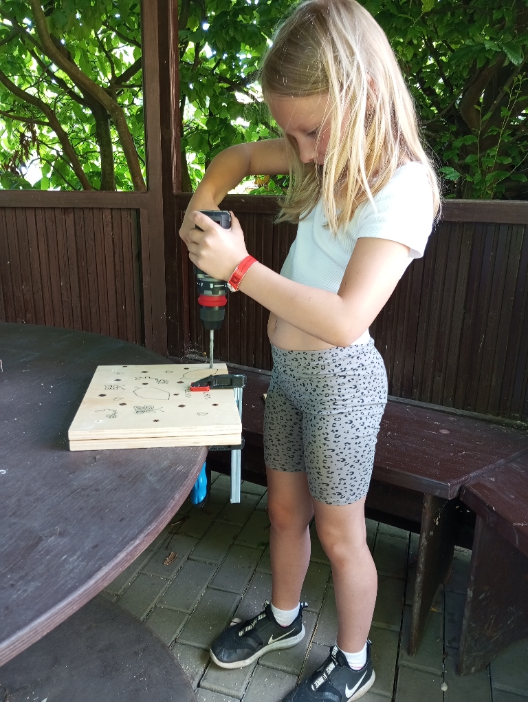 Po dokončení zdobení následovalo nalakování dřeva, které chrání povrch a zároveň zvýrazňuje kresbu vypalovaných motivů. V další fázi jsme pomocí vrtačky vytvořili otvory pro šrouby a děti si pak svůj lis kompletovaly – sestavily všechny části dohromady, připevnily šrouby a křídlové matky, a tím získaly plně funkční lis na květiny.