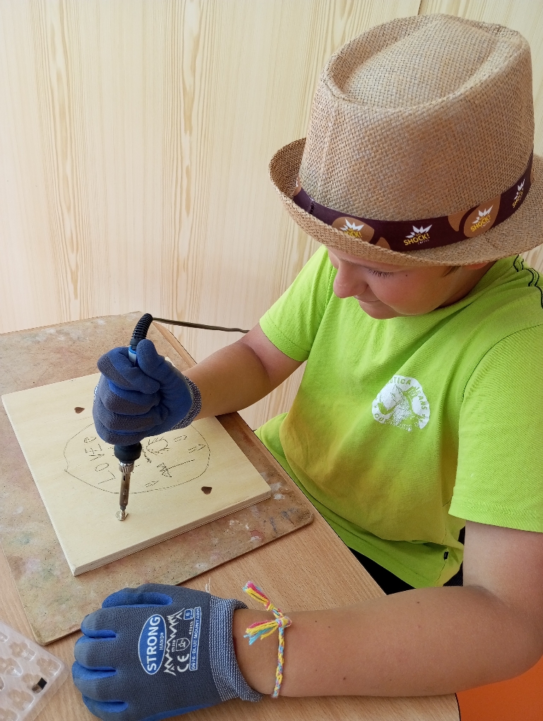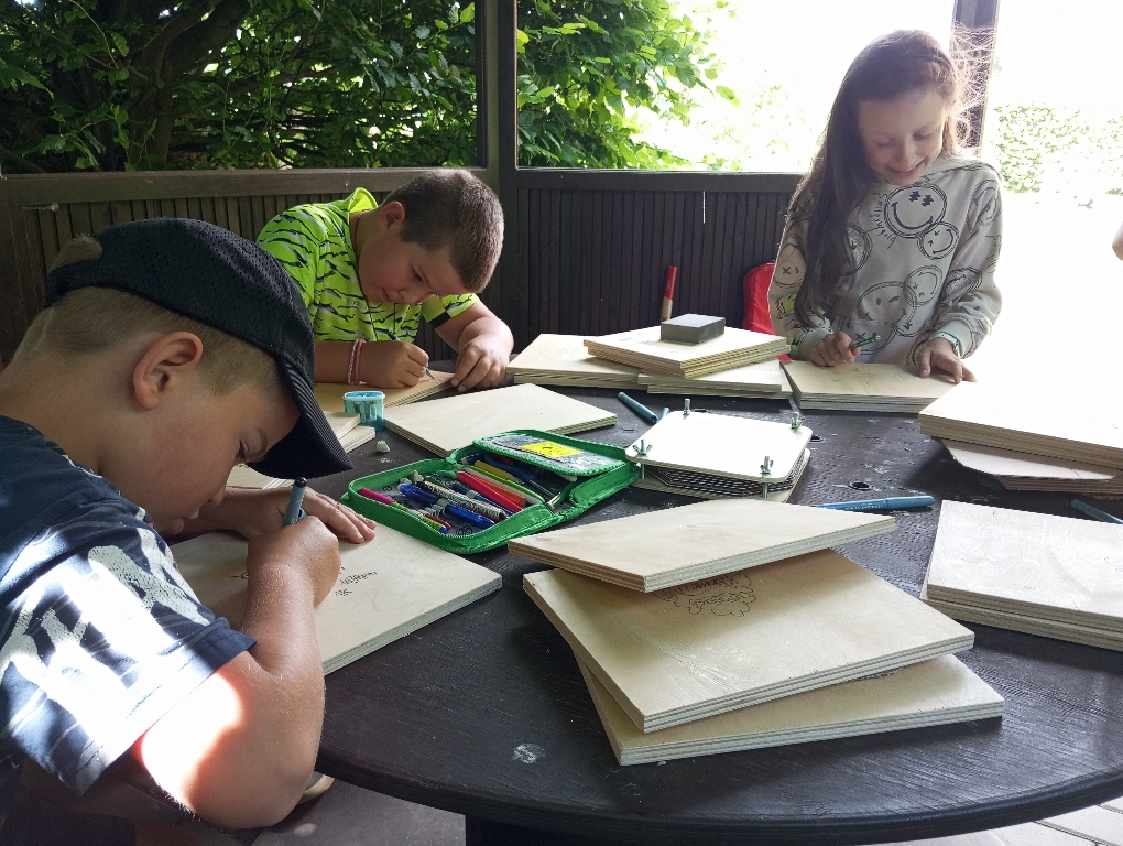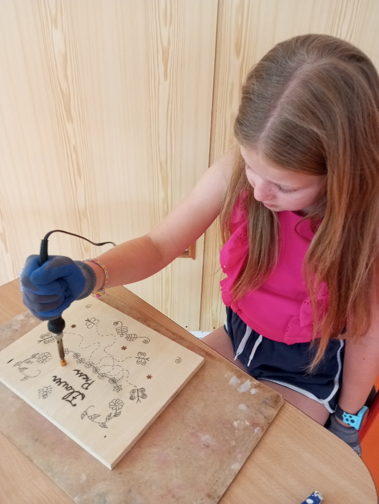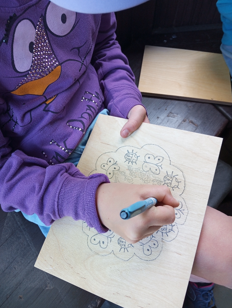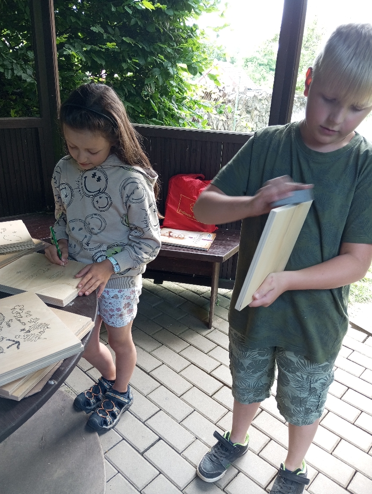 Na začátku bylo potřeba všechny dřevěné díly lisu důkladně osmirkovat, aby byly hladké a bezpečné na dotek. Následně si děti navrhly vlastní přírodní motivy, které si překreslily a obkreslily na přední stranu dřevěné desky. Pomocí vypalovacího pera pak opatrně vytvářely trvalý vzor – vznikly tak originální a krásně zdobené přední desky lisů.