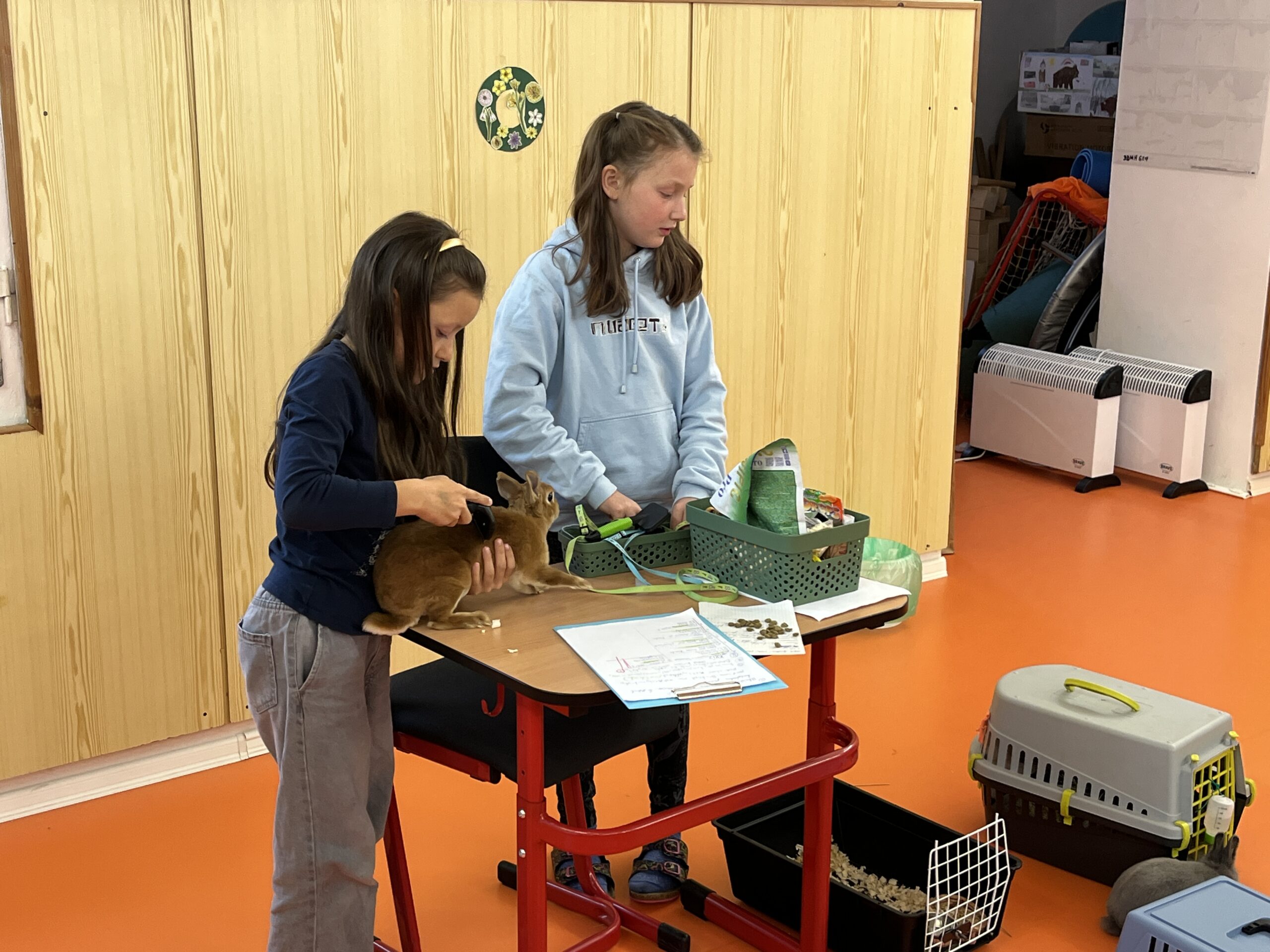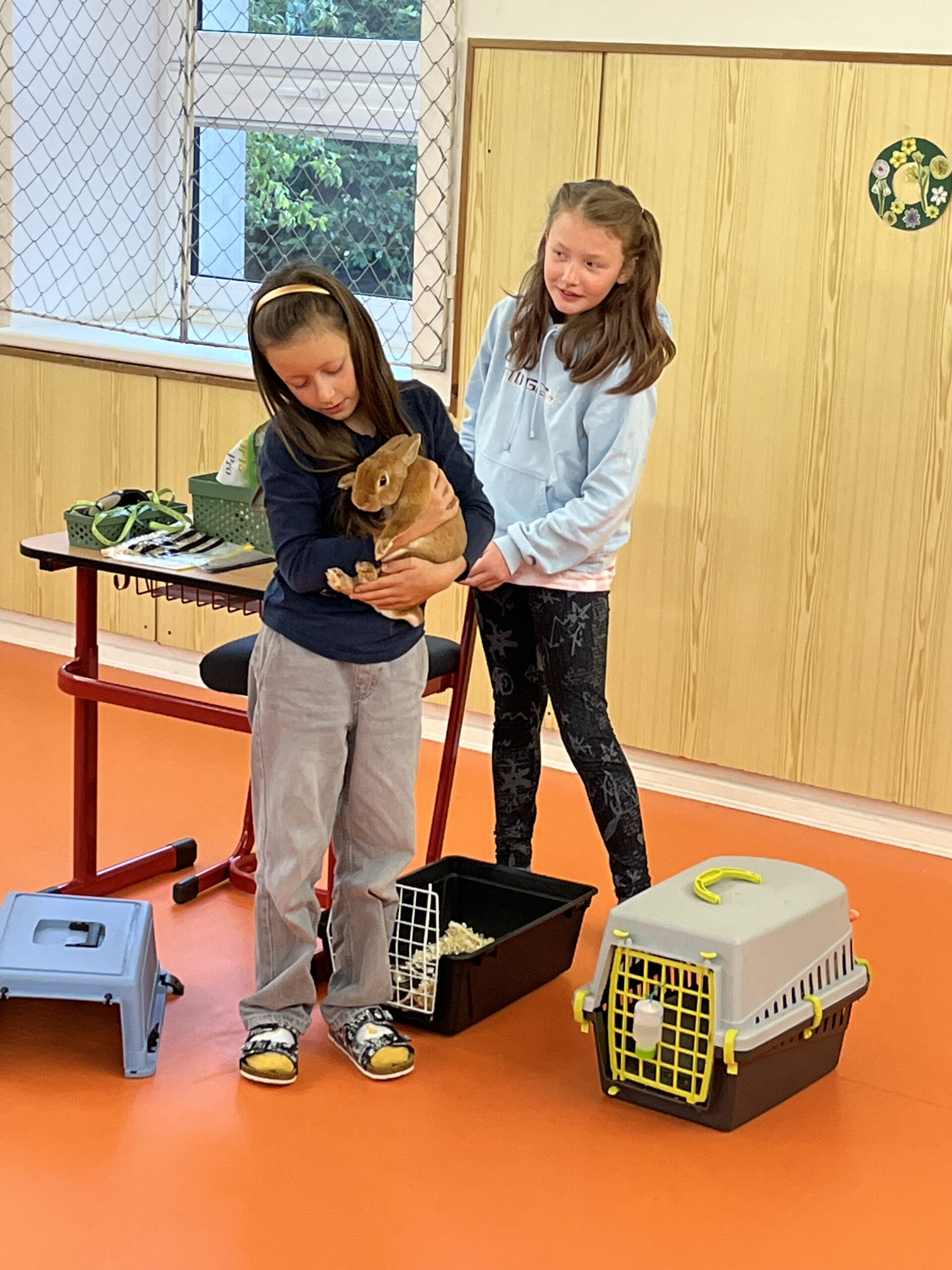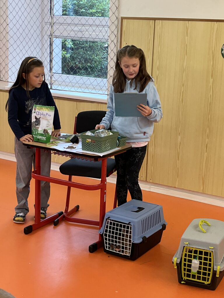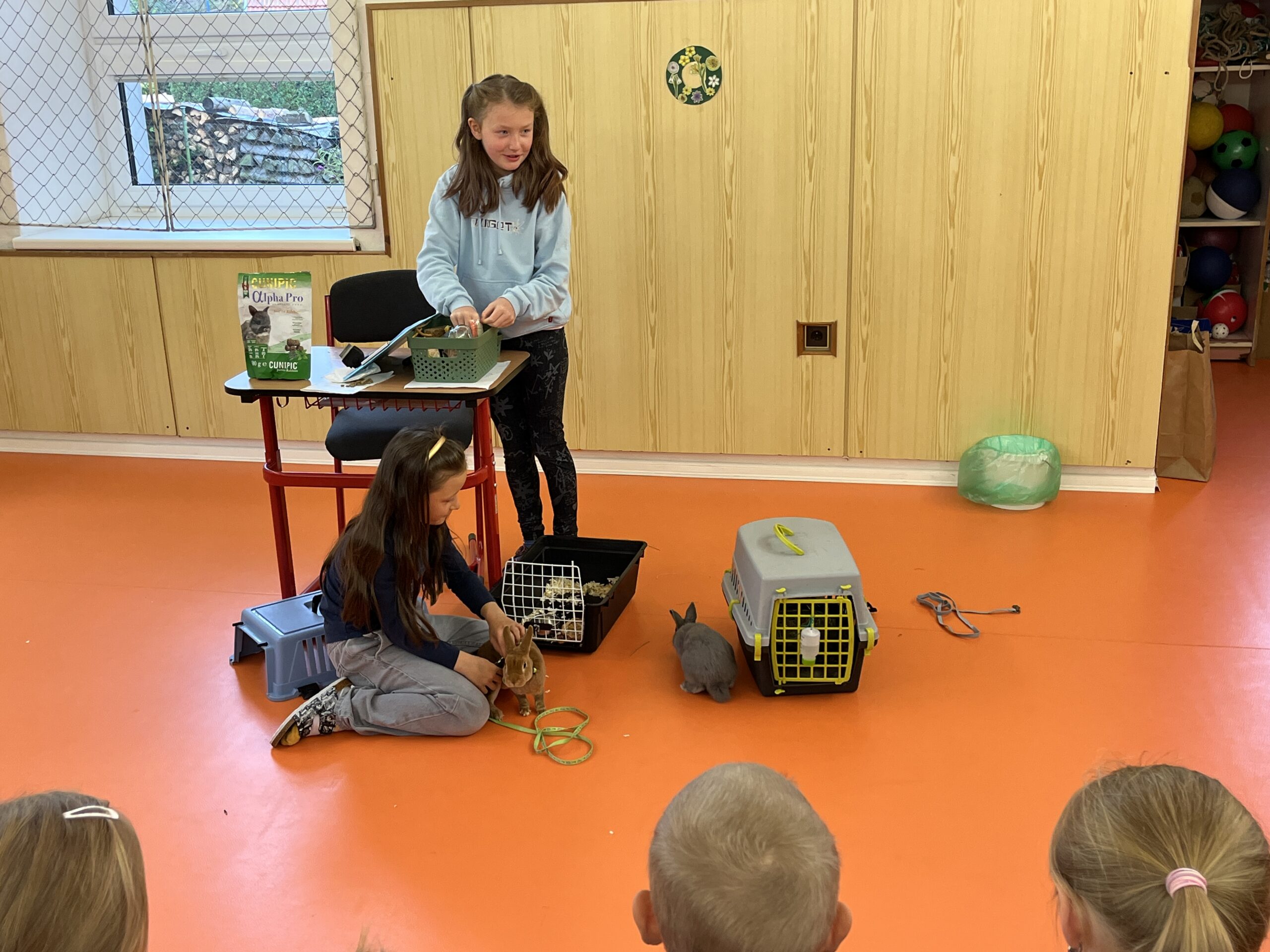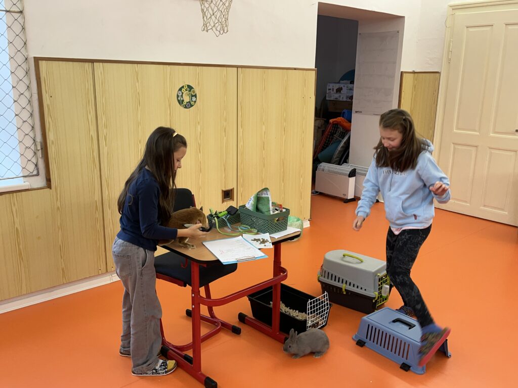 Děvčata nás velmi poutavě a podrobně seznámila s péčí o králíky. Dozvěděli jsme se, jak králíci bydlí, co potřebují mít v kleci a jaká je jejich každodenní péče. Ukázaly nám také předměty potřebné pro chov a vysvětlily, jak vypadá správná králičí strava.