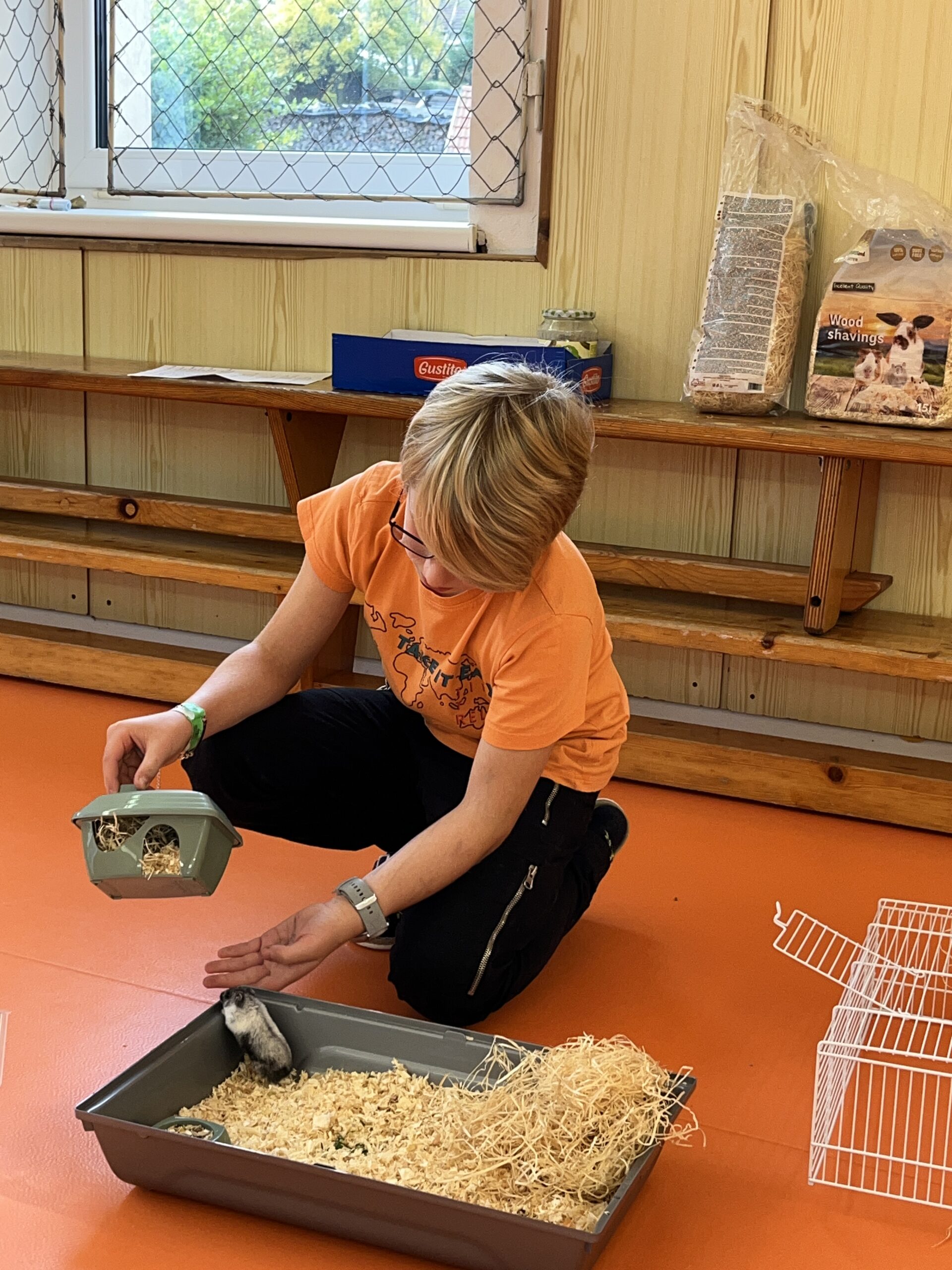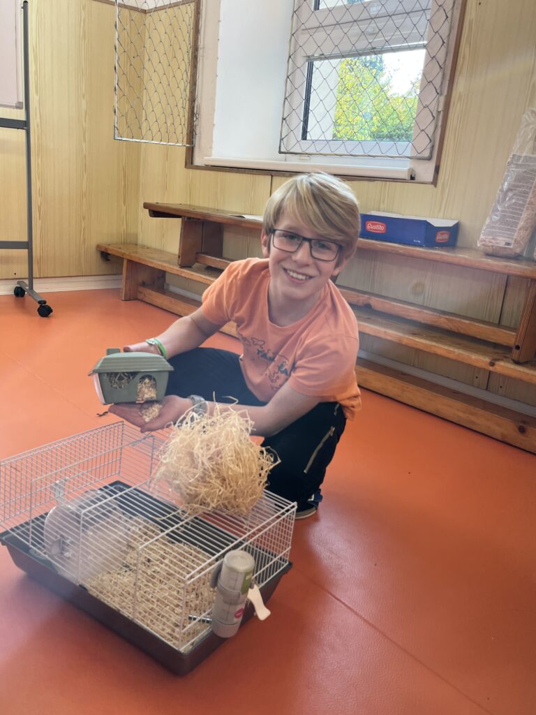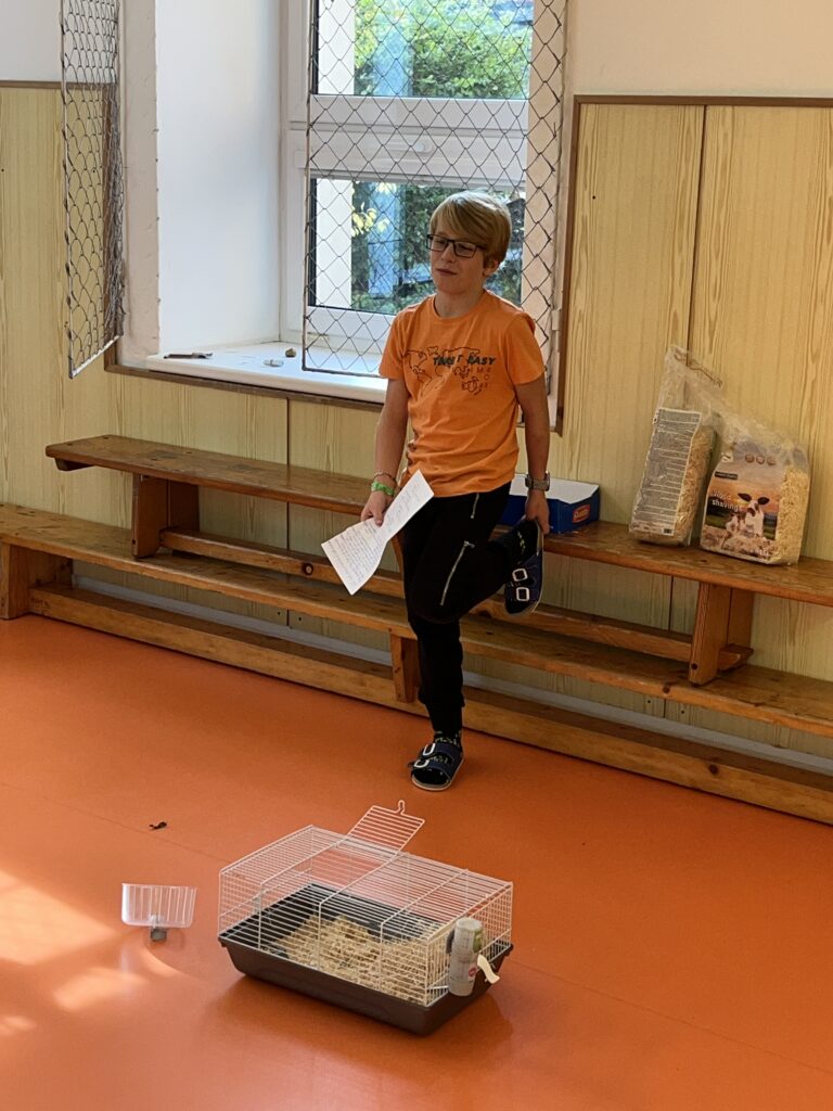 Adam nám vysvětlil, jakou péči křeček potřebuje. Dozvěděli jsme se, že křeček džungarský je malý, ale velmi aktivní tvor, který potřebuje čistou klec, čerstvou vodu a prostor na běhání. Adam také vyprávěl, čím Maxe krmí – nejraději má směs zrníček, kousky ovoce a zeleniny, a občas si pochutná i na speciálních křeččích pamlscích.
