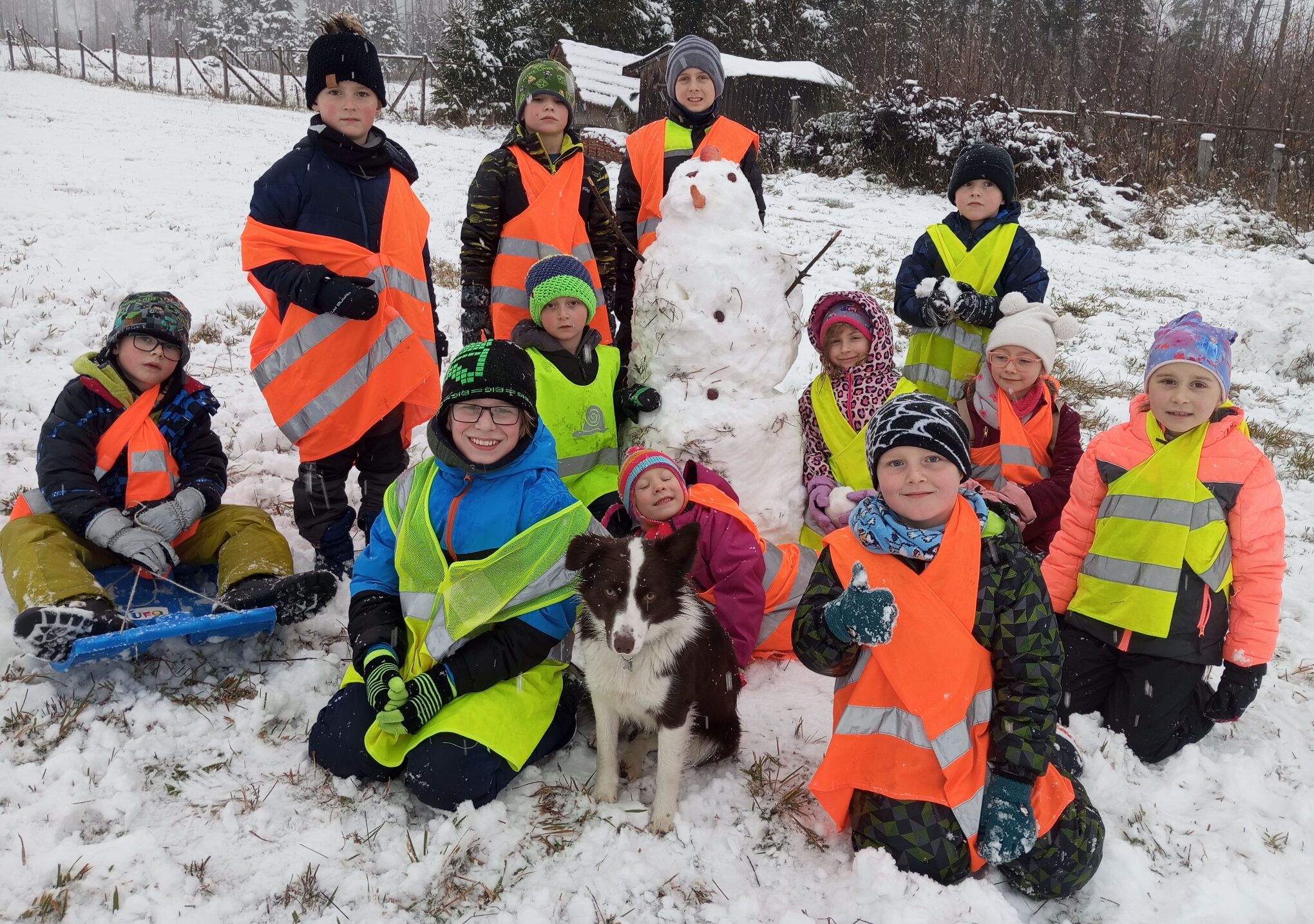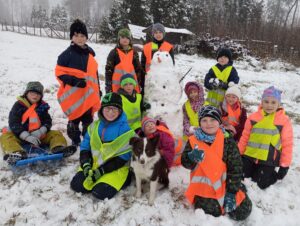 Cestou zpět si děti užily první letošní sníh a společnými silami postavily sněhuláka.