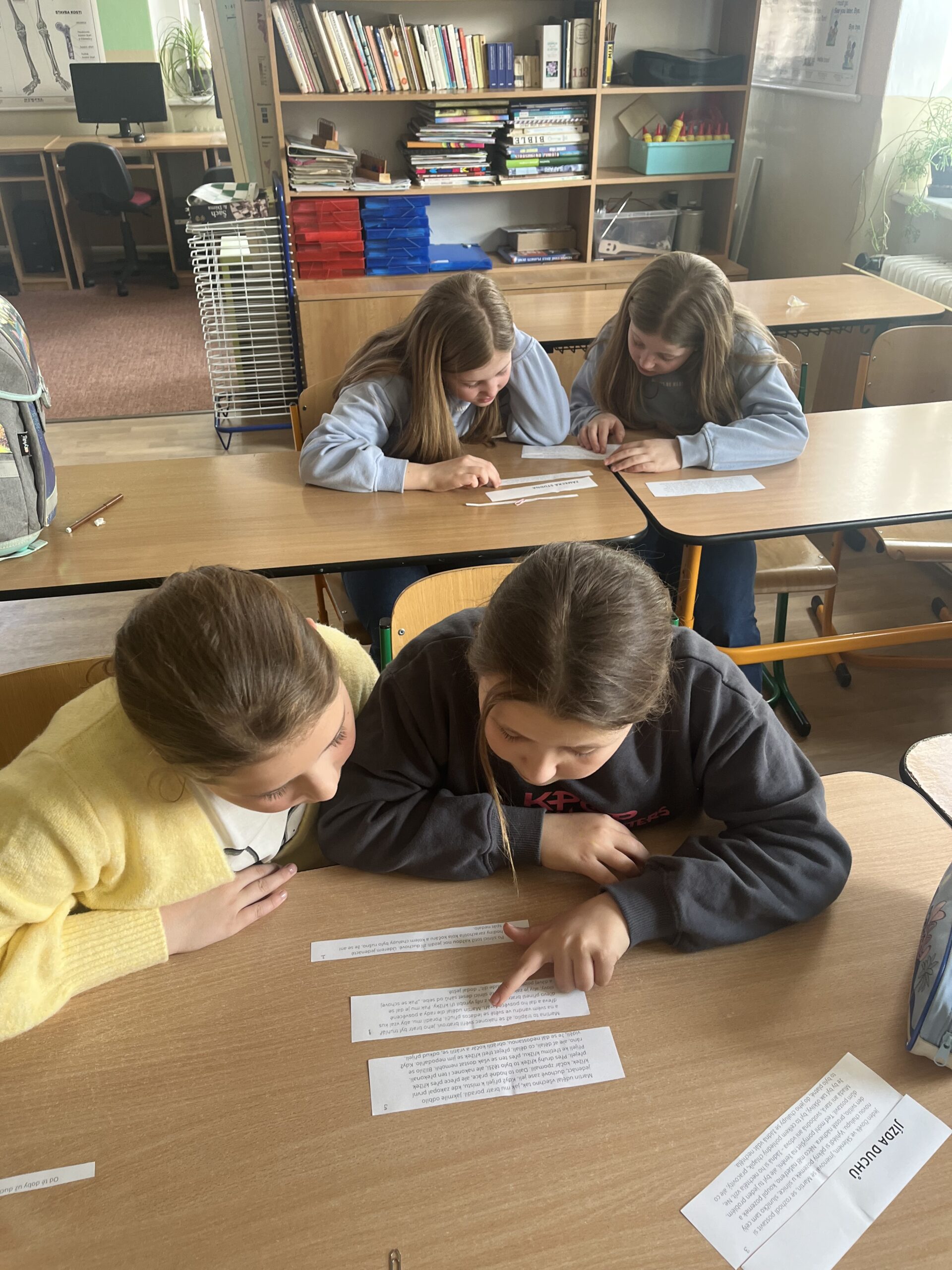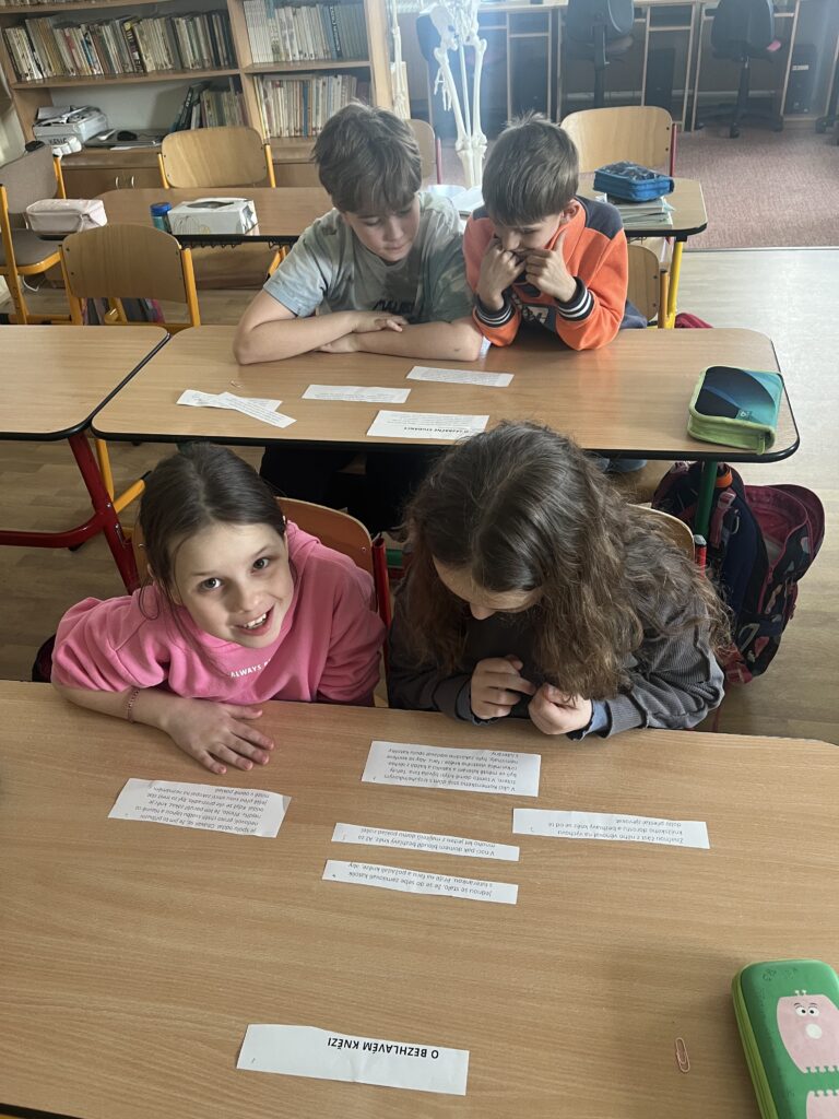 Nejprve každá z dvojic dostala rozstříhanou jednu z pověstí. Jejich úkolem bylo vše přečíst a text správně chronologicky seřadit. Poté svoji poskládanou pověst dvojice převyprávěla spolužákům a my se tak seznámili se všemi pověstmi, které nám v dané hodině sloužily k práci.