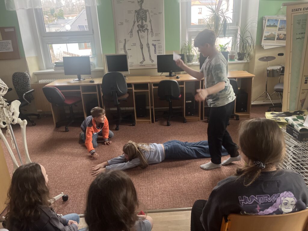 K dramatizaci nám posloužila pověst o vzniku Meziříčí. Její části si žáci rozdělili do čtyř skupin a ztvárnili je. Na závěr jsme si připravili malé divadelní představení a čtyři vystoupení tak utvořila jeden příběh o vzniku města.